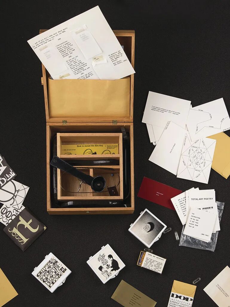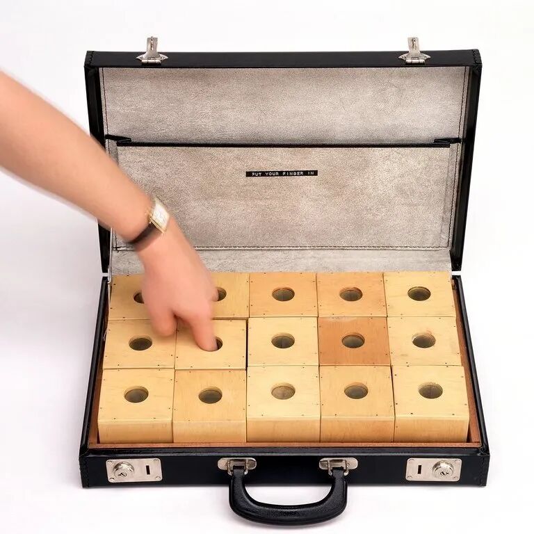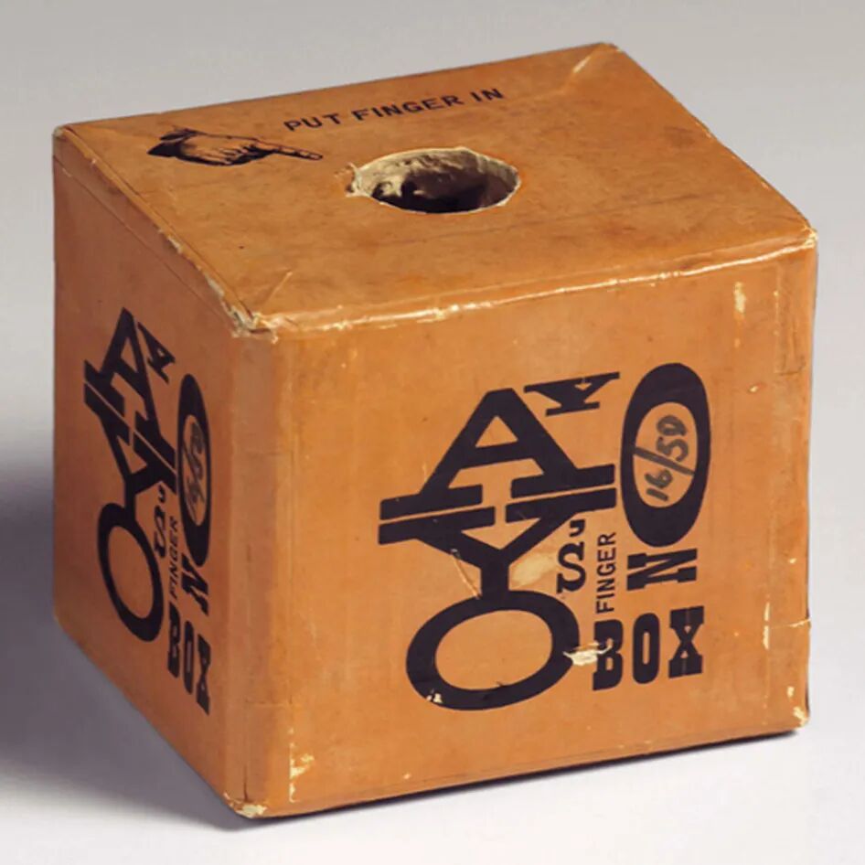 而日本艺术家 Ay-O 的《Finger Boxes》更早地实践了感官上的“开箱”:手指伸入看不见的空间,触碰未知的质感,激发心理层面的想象和紧张,这种经验并不依赖视觉,却构成完整的“揭晓”。
