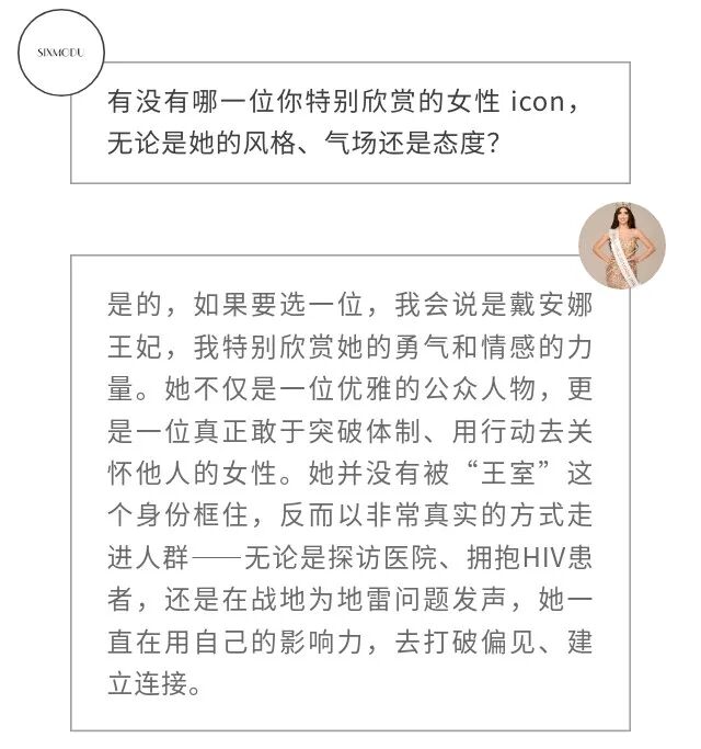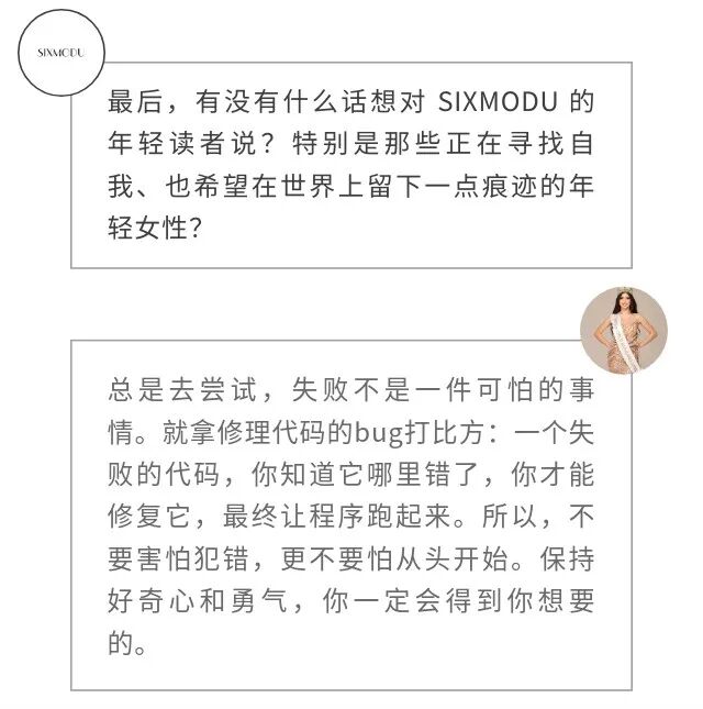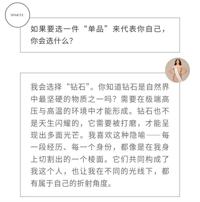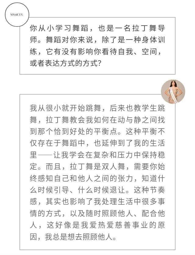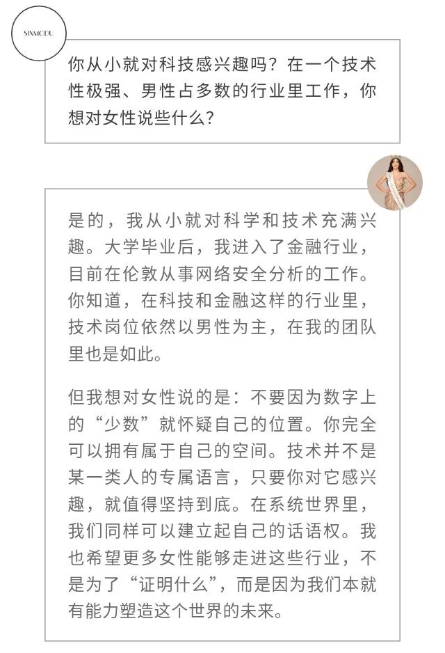 成为世界小姐,是这些长期工作的一次浮出水面。她的另一面,是舞者;是科技行业中为女性发声的倡导者;也是一个清楚意识到自身文化语境与公共身份边界的年轻人。