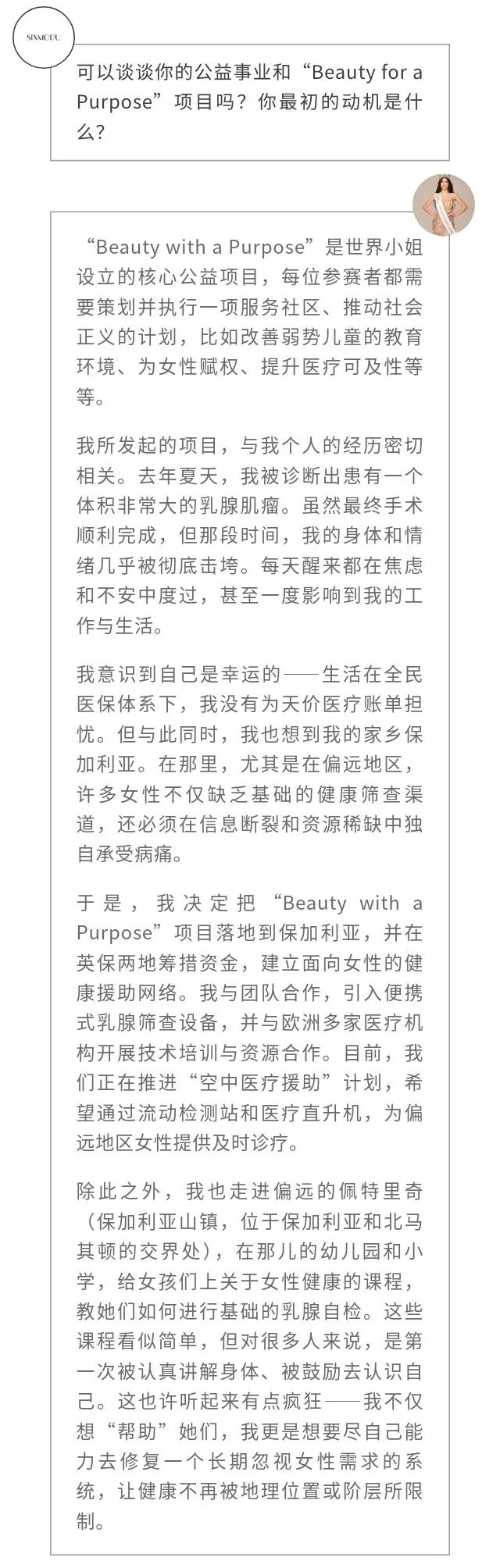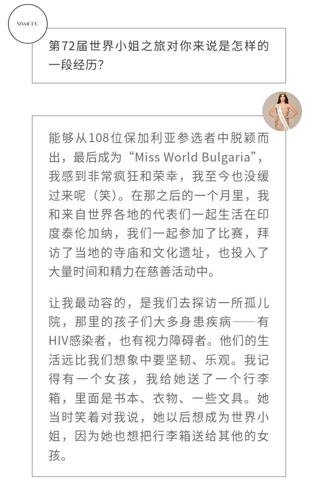 采访时,每当讲到印度的孤儿院的孩子,保加利亚山区里的小女孩们,Teodora都快要落泪,我能感受到这份情感的重量几乎溢出屏幕。在公众的想象中,“选美小姐”往往被简化为外表的展示,一场关于美貌和华服的竞赛。然而,Teodora Miltenova用她的经历有力地颠覆了这种刻板印象。她不仅仅是一个站在舞台中央的选手,更是一位深谙科技、拥抱公益、坚持自我成长的多面女性。她的故事提醒我们,外表的光鲜亮丽,在真正的女性力量面前显得微不足道。真正的力量,源自于内心的坚持,以及将热忱转化为行动的勇气。